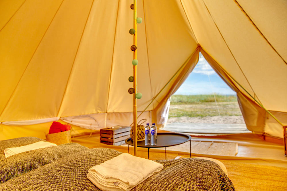 Endast 100 meter från stranden har vi i samarbete med Ljugarns Semesterby, ett antal canvastält uppsatta. Där bor du ombonat och mysigt!